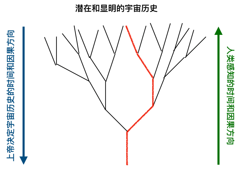 从这种意义上讲,量子物理的不确定性完美地实现了人类自由意志和上帝主权预定。这也正是普兰丁格等基督徒哲学家所提出的所有可能宇宙的量子版本,他们为了调和上帝的主权和人的自由意志提出了上帝中性知识的理论。其实,从上图中我们可以看到,上帝无疑知道所有的潜在宇宙历史,但是祂选择了最符合祂本性的宇宙历史。于是,上帝是根据哪一个宇宙历史的终极状态最能彰显祂自己的荣耀来选择显明一个宇宙历史。所以,上帝更多是从将来看过去,而我们是从过去看将来。